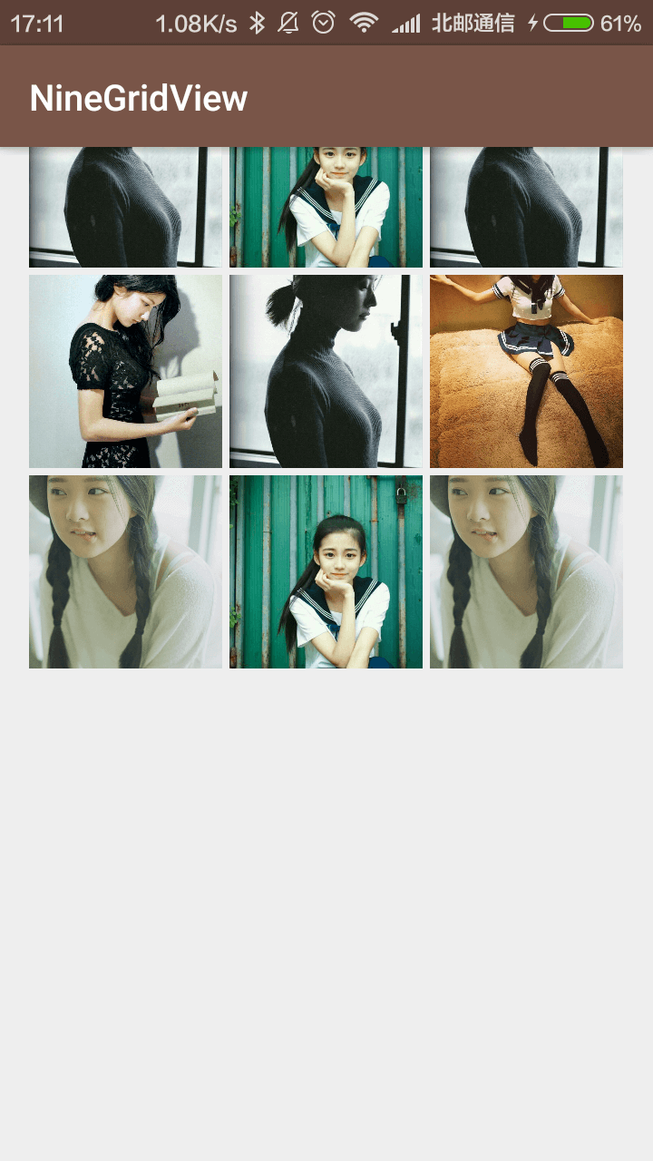 因为是一个比较新的控件,而且作者也已经开博讲解怎么使用,所以我不过多阐述如何使用,如有需求请转步作者博客http://laobie.github.io/android/2016/03/06/nine-grid-iamge-view-libaray.html来进一步了解。我来说一说我是怎么使用的。
